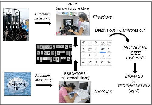 A group of scientists from the Institute of Oceanography, National Taiwan University, led by Dr. Carmen García-Comas and Prof. Chih-hao Hsieh, demonstrate that the interaction of predator and prey size diversities affects trophic transfer efficiency in marine plankton. This is the first study to analyze individual size structure at two trophic levels in plankton, and proposes mechanisms to explain variation of trophic transfer efficiency at contrasting marine environments. Conclusions of this study support size as an important functional trait, and contribute to implement size-based plankton models. Their results are published in the Proceedings of the Royal Society of London B (February 2016). The amount of food available to socio-economically important animals such as fish is related to how efficiently zooplankton (predators) convert their food (small unicellular plankton as prey) into body mass. In this work, the team employed the well-established argument that size represents the most important functional trait in aquatic ecosystems. With two different imaging tools, they analyzed the size diversity of both plankton trophic levels in the East China Sea. They found that low prey size diversity facilitates trophic transfer, whereas high predator size diversity promotes it. More importantly, the effect of two trophic levels is interactive; that is, the positive effect of predator size diversity on trophic transfer is high especially when prey size diversity is also high. The team proposed the following mechanistic explanations: 1) low prey size diversity implies the dominance of small fast-growing cells that can support more zooplankton, and also implies less defenses against predation; and 2) high predator size diversity favors transfer efficiency, especially when size diversity of prey is high, because a greater variety of predator sizes can take better advantage of the available prey through diet niche partitioning. This work is an outcome of the largest interdisciplinary ocean ecosystem research project in Taiwan: Effects of Global Change on Ocean Biogeochemistry and Ecosystems in the Seas surrounding Taiwan in the Northwest Pacific (ECOBEST) Reference: García-Comas, C., A. R. Sastri, L. Ye, C. Y. Chang, F. S. Lin, G. C. Gong, and C. H. Hsieh (2016) Predator size diversity promotes biomass trophic transfer and prey size diversity hinders it in planktonic communities. Proceedings of the Royal Society of London, Series B. 283: 20152129. http://rspb.royalsocietypublishing.org/content/283/1824/20152129.abstract |
