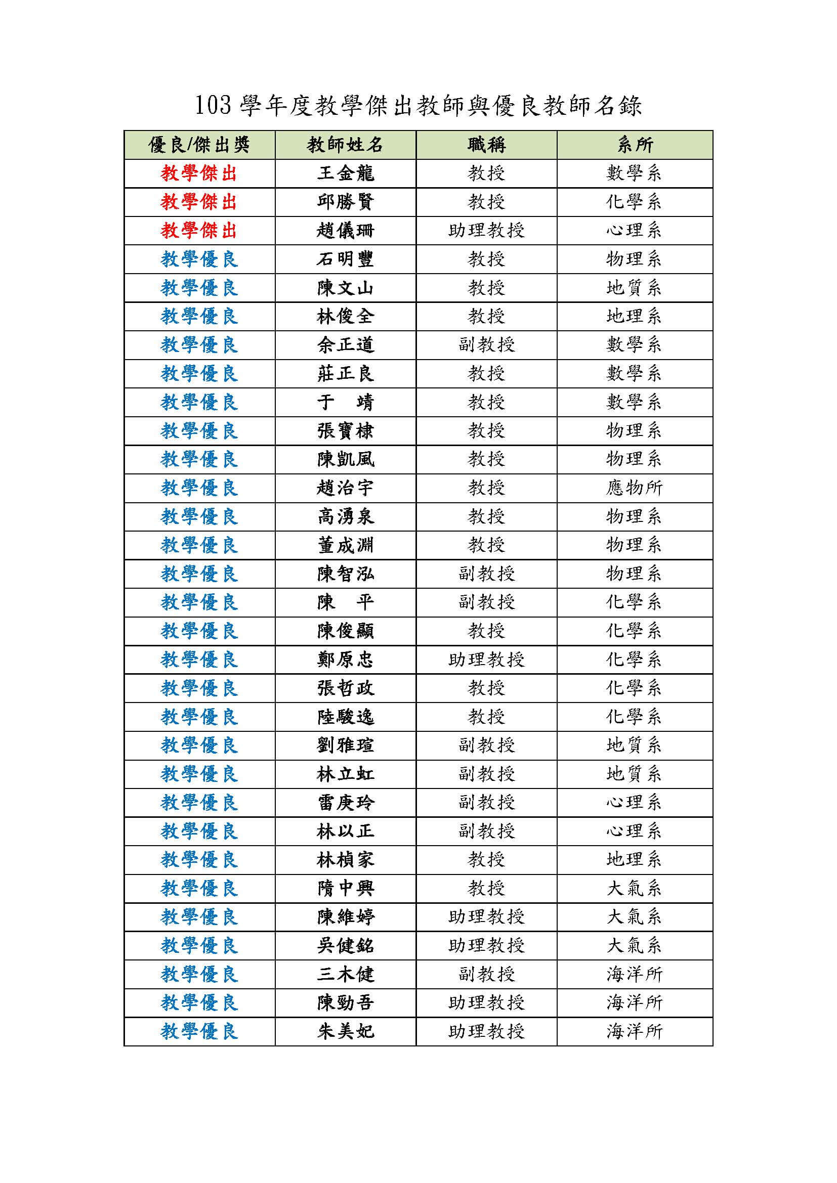 賀本院數學系王金龍教授、化學系邱勝賢教授、心理系趙儀珊教授榮獲103學年度教學傑出教師,物理系石明豐教授等28位教師榮獲教學優良教師!Post published:2015 年 9 月 7 日Post category:最新消息 / 榮譽最後修改日期:2020 年 5 月 18 日 Opens in a new window Facebook Opens in a new window X Read more articles 前一則文章賀本院心理學系黃光國教授榮獲本校104學年度「傅斯年紀念講座」。 下一則文章賀本院化學系陳浩銘助理教授研究成果榮登國際期刊Nature Communications