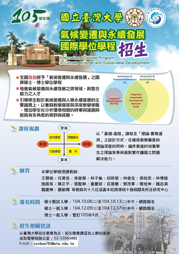 氣候變遷與永續發展國際學位學程自105學年度起招生,歡迎踴躍報考!Post published:2016 年 2 月 18 日Post category:公告 / 最新消息 相關連結:http://www.ipcs.ntu.edu.tw/index.php最後修改日期:2020 年 5 月 18 日 Opens in a new window Facebook Opens in a new window X Read more articles 前一則文章105年度理學院推廣國際交流獎學金時程公告 下一則文章賀本院大氣系羅敏輝老師參與國際研究團隊之合著研究成果榮登Science(2016.2.12)。