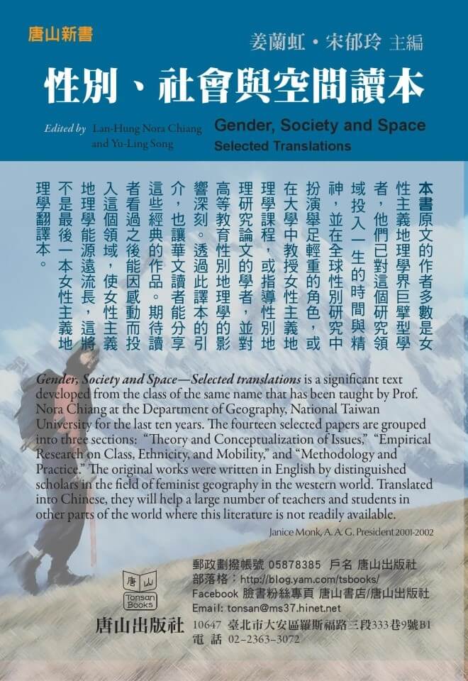 「性別、社會與空間讀本」是一本女性主義經典譯著,原文作者多數是女性主義地理學界巨擘型學者,內容涵蓋性別地理學的概念、方法與理論,以及經驗研究。經驗研究部分包含性別當中需要關注的族群與階級以及流動的問題,適時地討論了當代全球化下亞洲中產階級女性所扮演越來越重要的遷移者角色,除了彌補現有相關譯著中多以西方理論文獻為主的匱缺之外,也彌補台灣地理學界性別研究作品數量成長緩慢的現況。更多介紹如照片3。