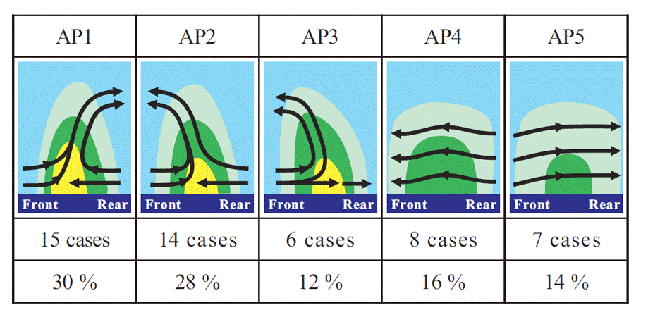| 圖1 垂直颱風雨帶方向的回波和氣流剖面示意圖。AP1~AP5代表5種不同特徵的風場結構。粗箭頭代表雙都卜勒雷達合成所觀測到的主要氣流樣式,色階代表雨帶回波結構。不同類別的雨帶個案數和百分比顯示在每張小圖的下方。 |