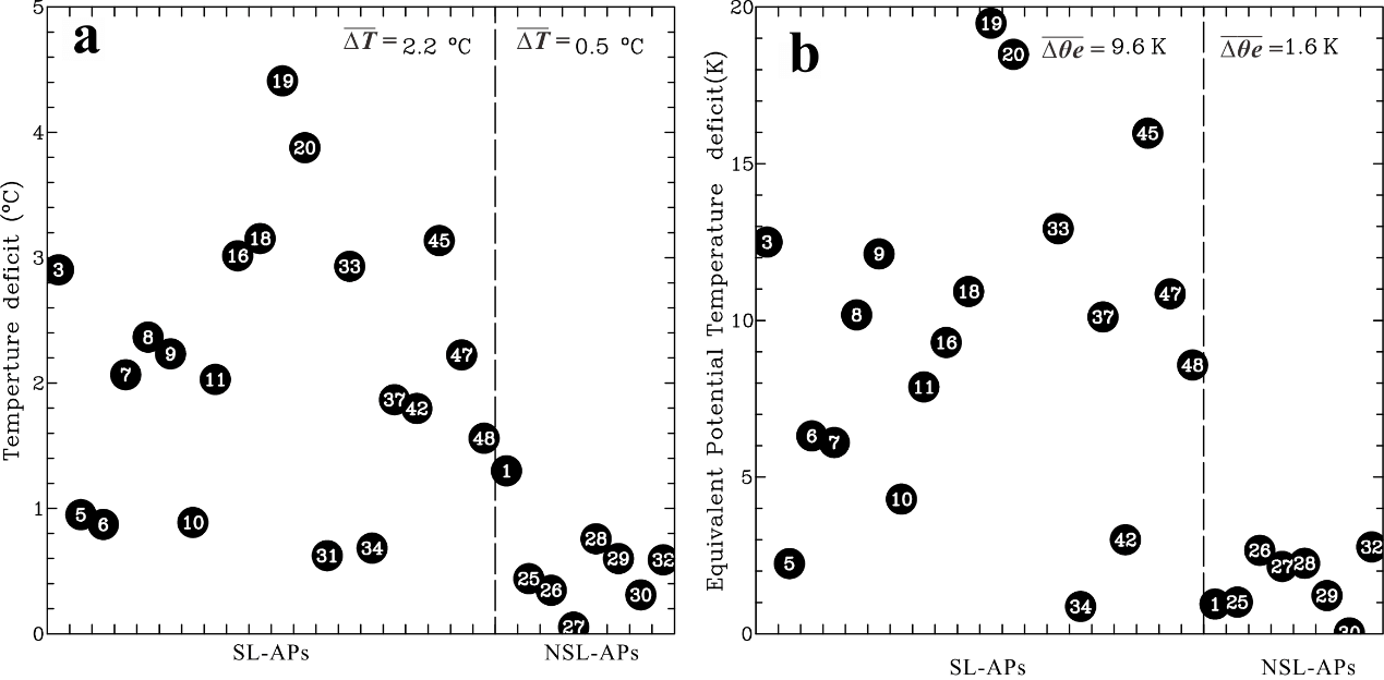 | 圖2 (a)類似颮線氣流結構之颱風外圍雨帶(SL-APs, 20 TCR cases)及非颮線氣流結構之颱風外圍雨帶(NSL-APs, 8 TCR cases)的地表降溫振幅(單位為°C)。黑圓圈代表雨帶個案,其中的白色數字為個案編號。平均溫度振幅值顯示在圖的右上角。(b)同(a),但為相當位溫變化振幅(單位為K)。由於個案31缺乏濕度資料無法計算相當位溫,所以此個案並沒有顯示在圖(b)中。 |